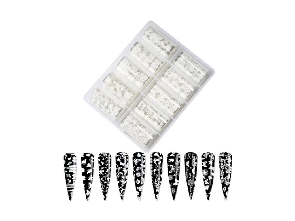 Zdobící nehtové fólie, které se snadno obtisknou do FOIL Clear gelu kód 111201 (vytvrzení 30 sekund a můžete obtisknout). Rozměr fólie 4x100cm V balení 10 druhů bílých motýlků