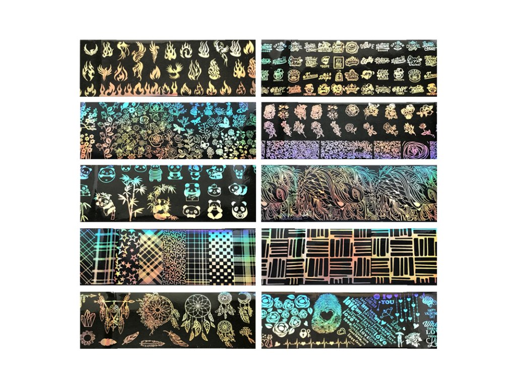 Zdobící stříbrné duhové fólie v sáčku, ve kterém je 10ks fólií různých motivů. Rozměr jednotlivé fólie: (4x20cm) Doporučujeme použít FOIL Clear gel 111201, který zapečete 30-45 sekund a můžete obtisknout fólii.
