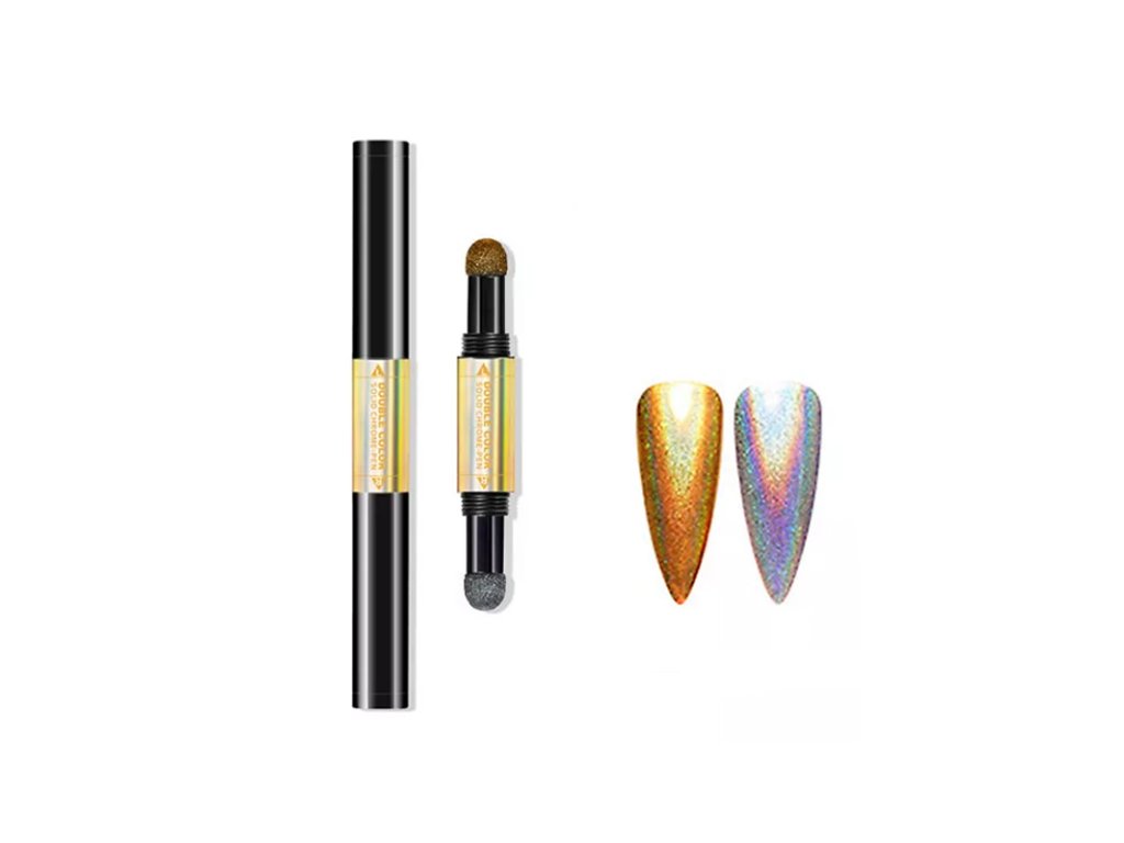 Pudr zalešťovací přímo v aplikační oboustranné tužce s houbičkami - 2 odstíny pudrů (holografický zlatý a stříbrný).