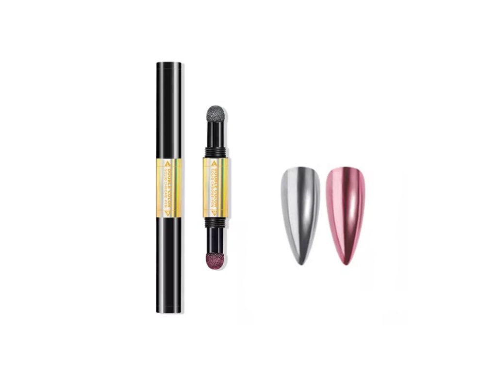 Pudr zalešťovací přímo v aplikační oboustranné tužce s houbičkami - 2 odstíny pudrů (růžový a stříbrný).