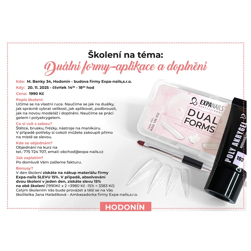 Pokud máte zájem o Školení v Hodoníně na téma " Duální formy - aplikace a doplnění", které se koná ve čtvrtek 20.11.2025 od 14:30 - 18:30 hod. kontaktujte nás na tel: +420 775 724 707 nebo email: obchod@expa-nails.cz