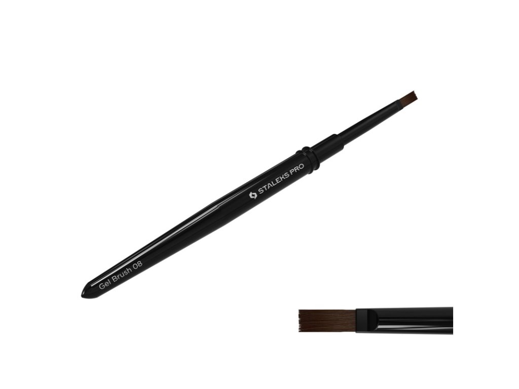 Štětec na gel - rovný tvar pro efektivní aplikaci gelu na větších plochách nehtu. Štětiny ze syntetických vláken zajišťují vynikající pružnost a odolnost a pohodlný tvar hliníkové rukojeti umožňuje snadné držení.