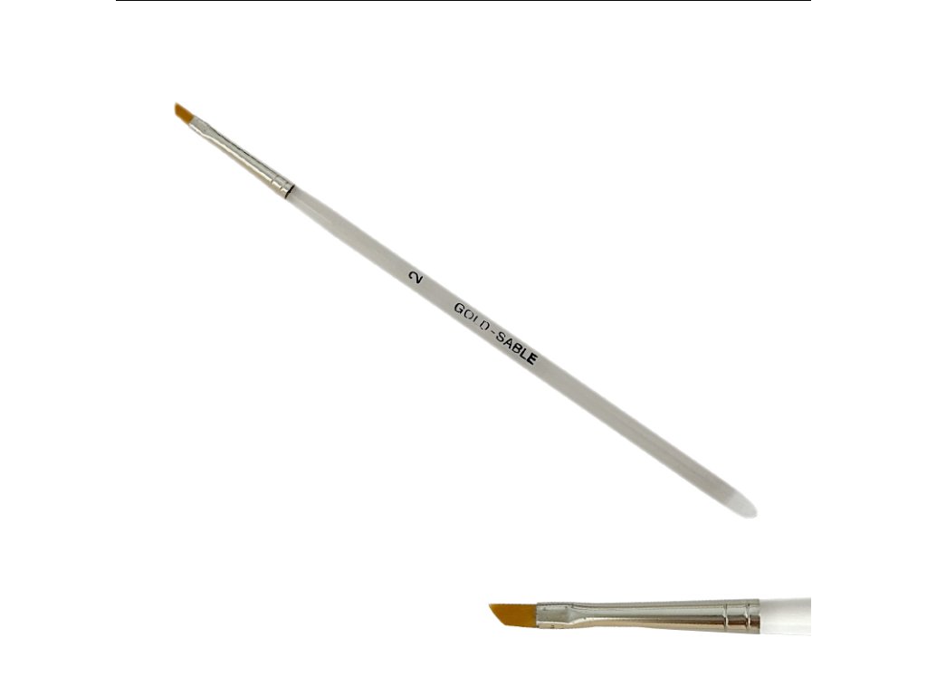 Štětec na nehty Gold Sable č.2 - plochý, zkosený, načervenalý syntetický vlas - Gold Sable, bezešvá stříbrná zděř, akrylátové držátko.