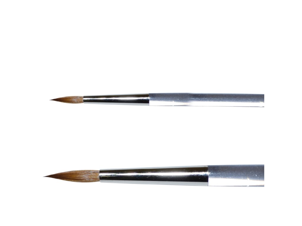 ŠTĚTEC č.4 - kulatý, špičatý, vhodný na gel i akryl, bezešvá stříbrná zděř, průhledné akrylové držátko, vlas Kolinsky-Rotmarder.