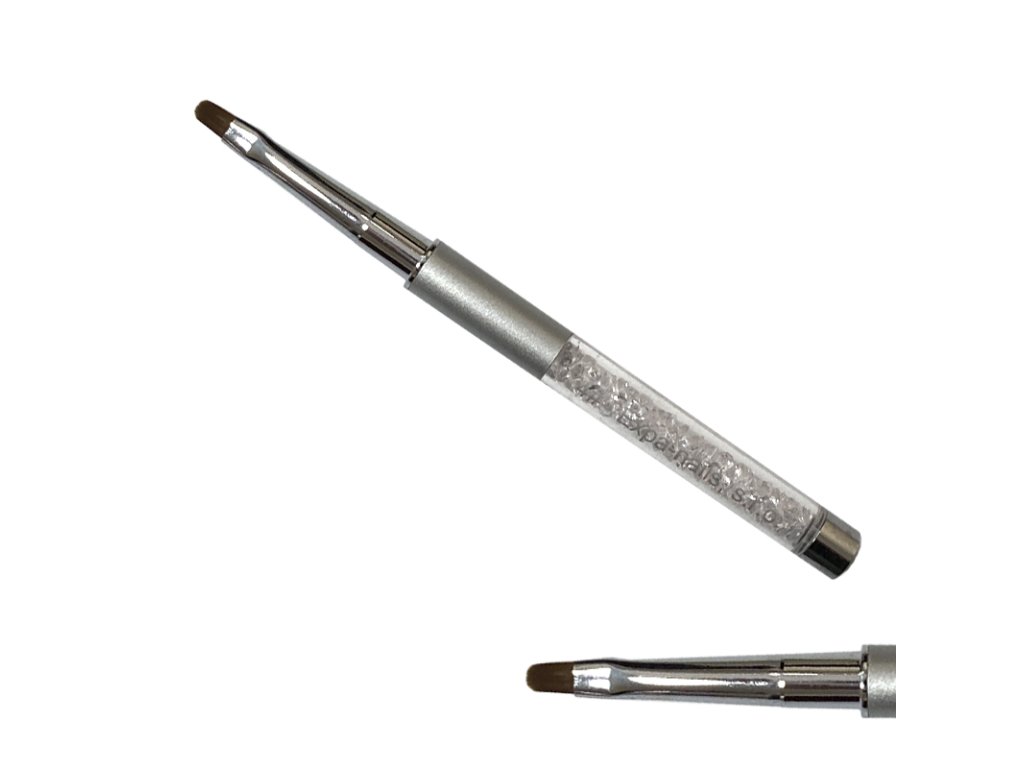 Luxusní štětec č. 4 plochý, zakulacený, umělý vlas, který je vhodný na gel. Délka vlasu: 6mm Celková délka štětce: 13,2cm Rukojeť je ozdobena ČIRÝMI kamínky.