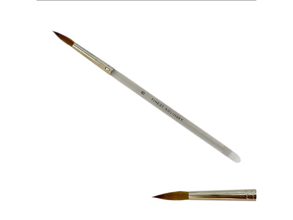 Štětec na nehty Kolinsky č.8 - kulatý, špičatý, vlas z kolonoka (Mustela siberica), bezešvá stříbrná zděř, akrylátové držátko.