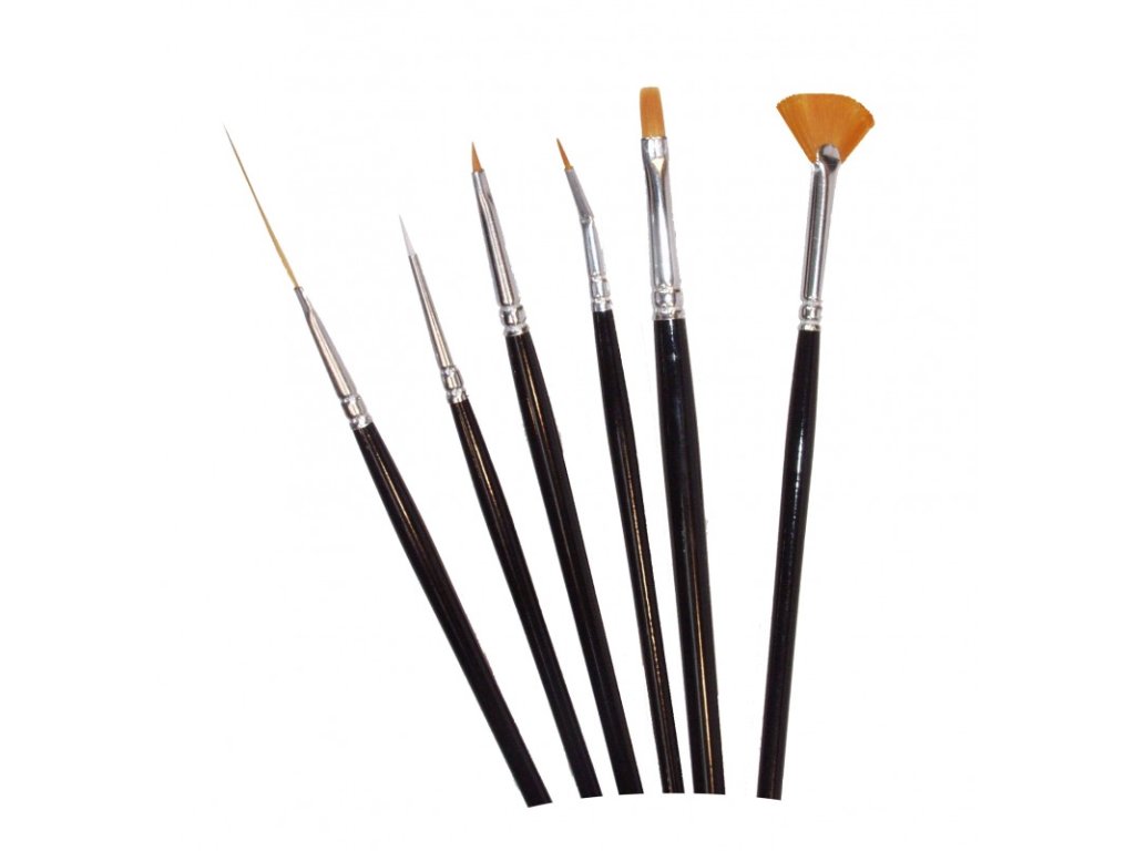 Štětec na nehty Gold Sable - v 6dílné sadě, načervenalý syntetický vlas - Gold Sable, bezešvá stříbrná zděř, leské černé lakované držátko. Sada obsahuje následující štětce: - plochý rovný - plochý tvar kočičí jazýček - kulatý špičatý - vějířek, - na proužky Striper - zahnutý