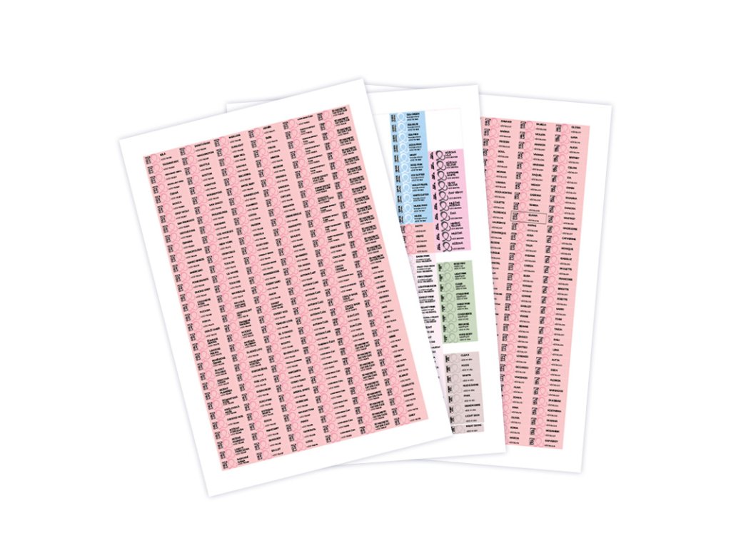 Štítky na vzorníky obsahují aktuální barevné Gel laky, Poly akrygely, Fiber gely, Rubber gely, Make-up gely a závěrečné tónované lesky (Quick finish + Top coat) do roku 2024