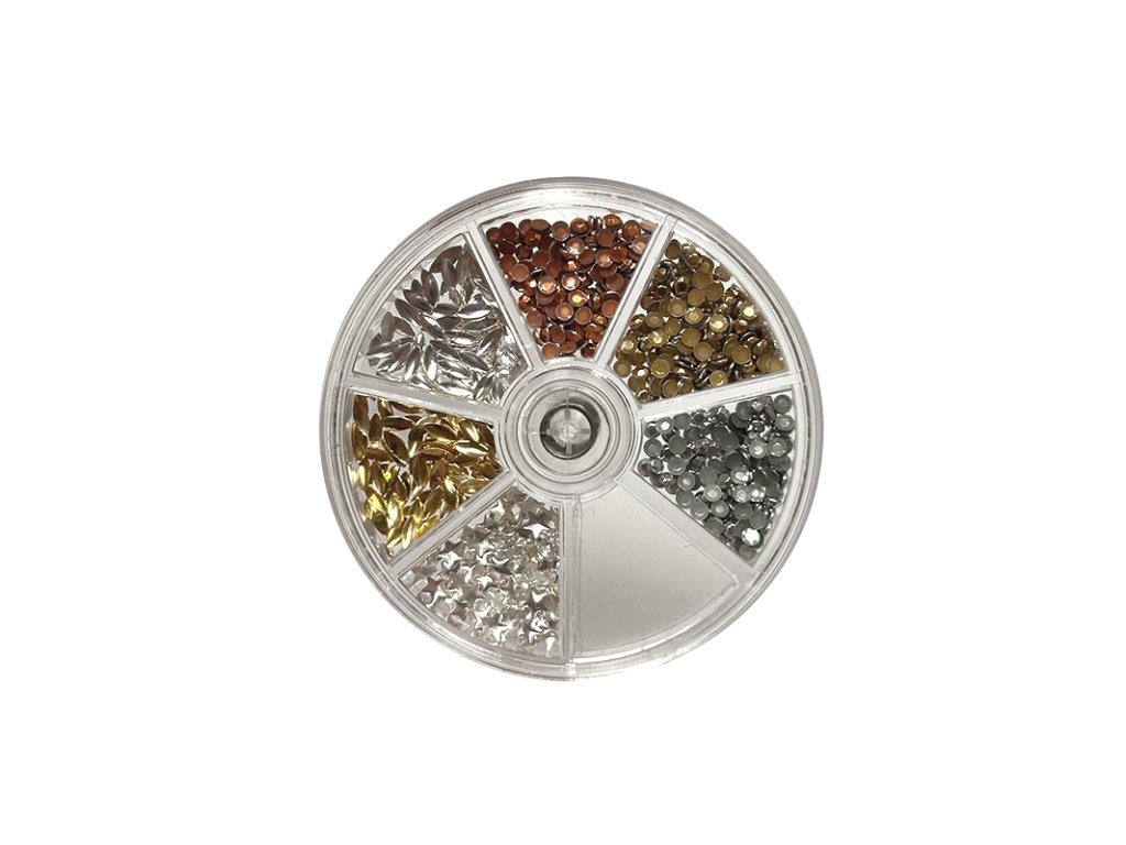 Kovové ozdoby mix v praktickém karuselu v barvě stříbrné, zlaté a bronzové. Nahrazují kamínky a lze s nimi vytvořit krásné zdobení na nehtech dle vlastní fantazie.